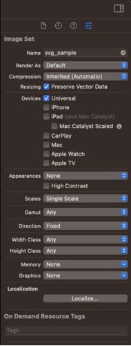 目次 アセットの定義 アセットの定義 Xcodeのプロジェクト内にて、「Assets」を開き、「Image Set」を追加します。 追加したImage Setにて、以下設定を行います。 ・「Resizing」の「Preserve Vector Data」 にチェックを入れる。 ・「Scales」を「Single Sc…